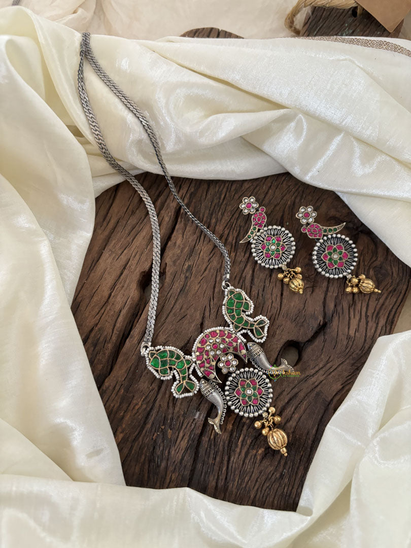 Dual Tone Statement Jadau Kundan Pendant Chain Neckpiece –semi precious kundan stones jadau work designer pendant and earrings