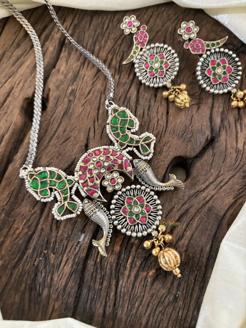 Dual Tone Statement Jadau Kundan Pendant Chain Neckpiece- J1888
