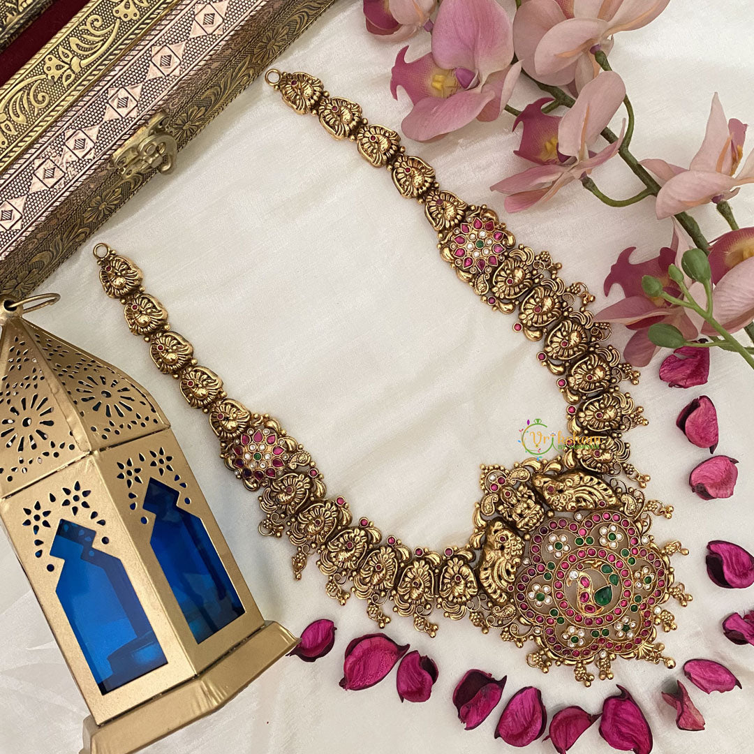 Indulge in luxury and sophistication with our Elegant 1 gm Gold AD Stone Peacock Pendant Haram. Adorned with intricate peacock detailing and sparkling AD stones, this pendant exudes exclusivity and elegance. Crafted with 1 gm gold, it is the perfect statement piece for any occasion. Enhance your style and grace with this stunning haram.