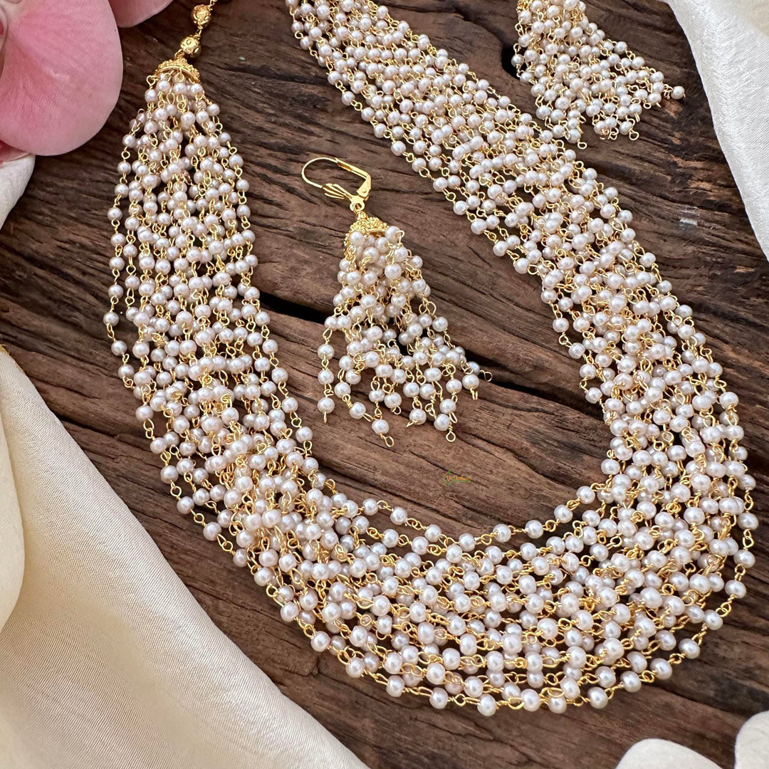 Layered Pearl and White Bead Malai -16 layers, 22inch lengthy neckpiece; rows of beads arranged into layers with upper pearl malai. comes with earrings.