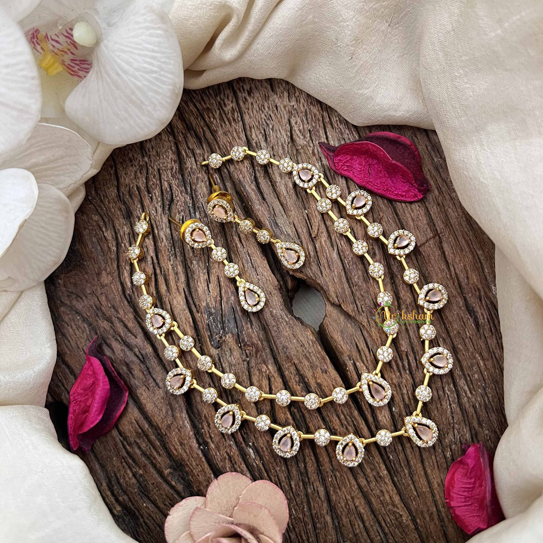 Elevate your look with our elegant 2 layer short neckpiece. Adorned with sparkling AD stones and a teardrop design, this necklace adds a touch of sophistication to any outfit. Perfect for special occasions or everyday wear, it's a must-have for your jewelry collection. Comes with matching earrings.