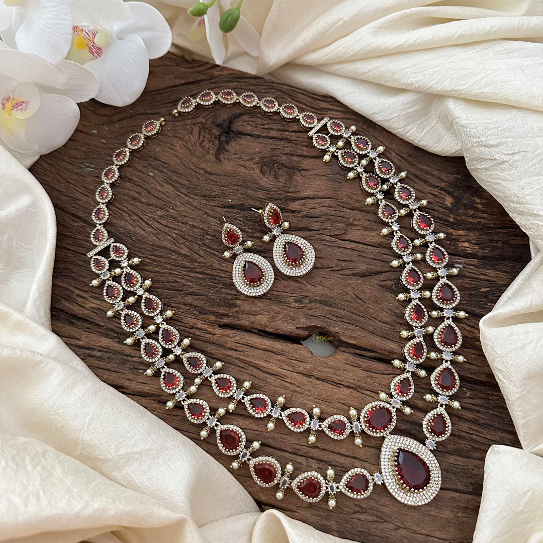 Indulge in luxury with our Elegant 2 Layer Red Victorian Diamond Neckpeice-Tear Drop. This stunning piece features intricate diamond detailing and comes with matching earrings for a complete, sophisticated look. Elevate your style and make a statement with this exclusive neckpiece.