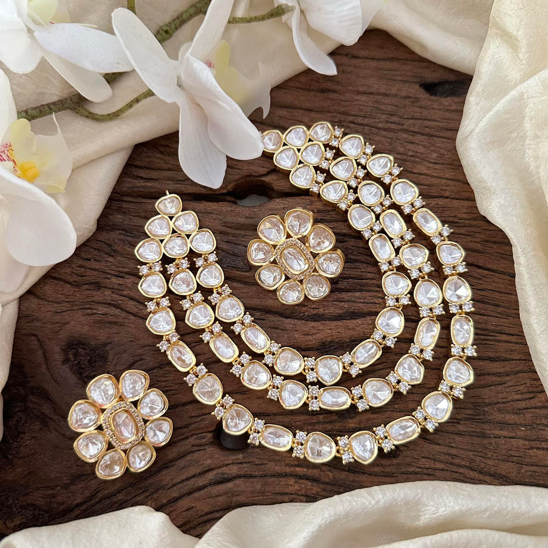 This exquisite neckpiece features 3 layers of intricately designed Kundan, exuding elegance and sophistication. Perfect for elevating any outfit, it adds a touch of luxury to your wardrobe. Make a statement with this exclusive piece, reminiscent of art and luxury in the world of fashion. Comes with matching earrings.