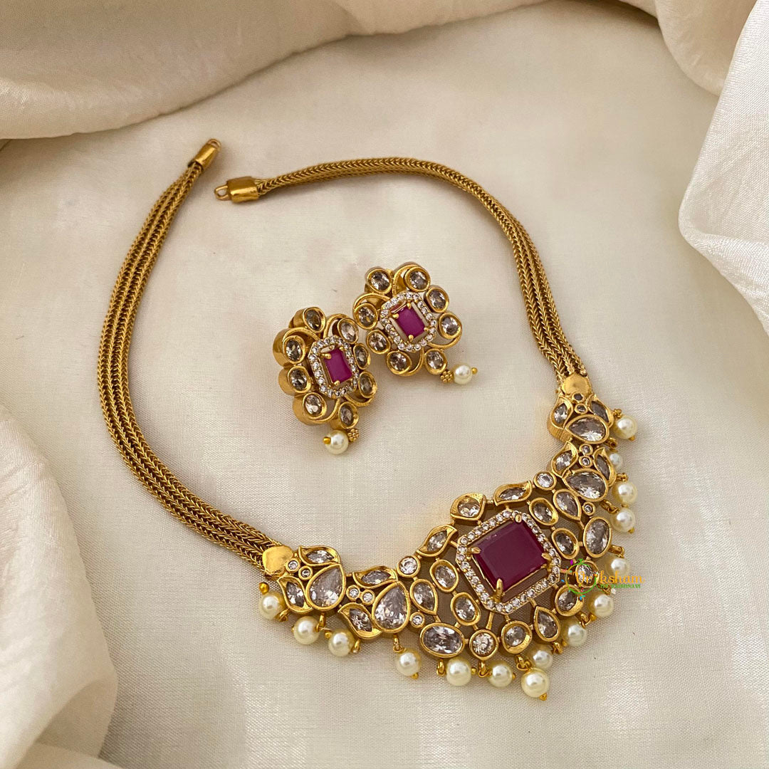 Elegant AD Stone Addigai Choker- Premium quality red white AD Stone studded Addigai follows the pattern of One big square red center stone surrounded by white stone. Finishing it white pearls to make it elegant for any occasion. Hasli short neckpiece, comes with matching earrings.