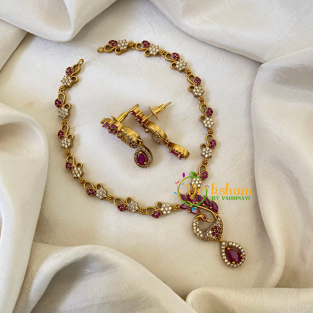 Elegant AD Stone Choker Short Neckpiece with peacock pattern and peacock pendant; comes with matching ear hangings.