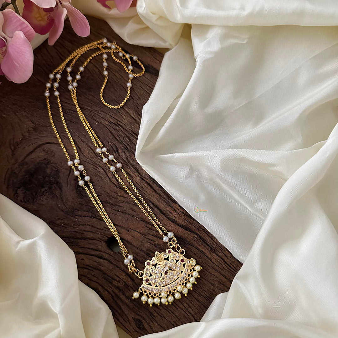 Indulge in luxury with our Elegant AD Stone Dual Anam Pendant Chain. The timeless design features lustrous pearls adorning a stunning dual anam pendant, exuding sophistication and exclusivity. Enhance any outfit with a touch of elegance and elevate your style to new heights.