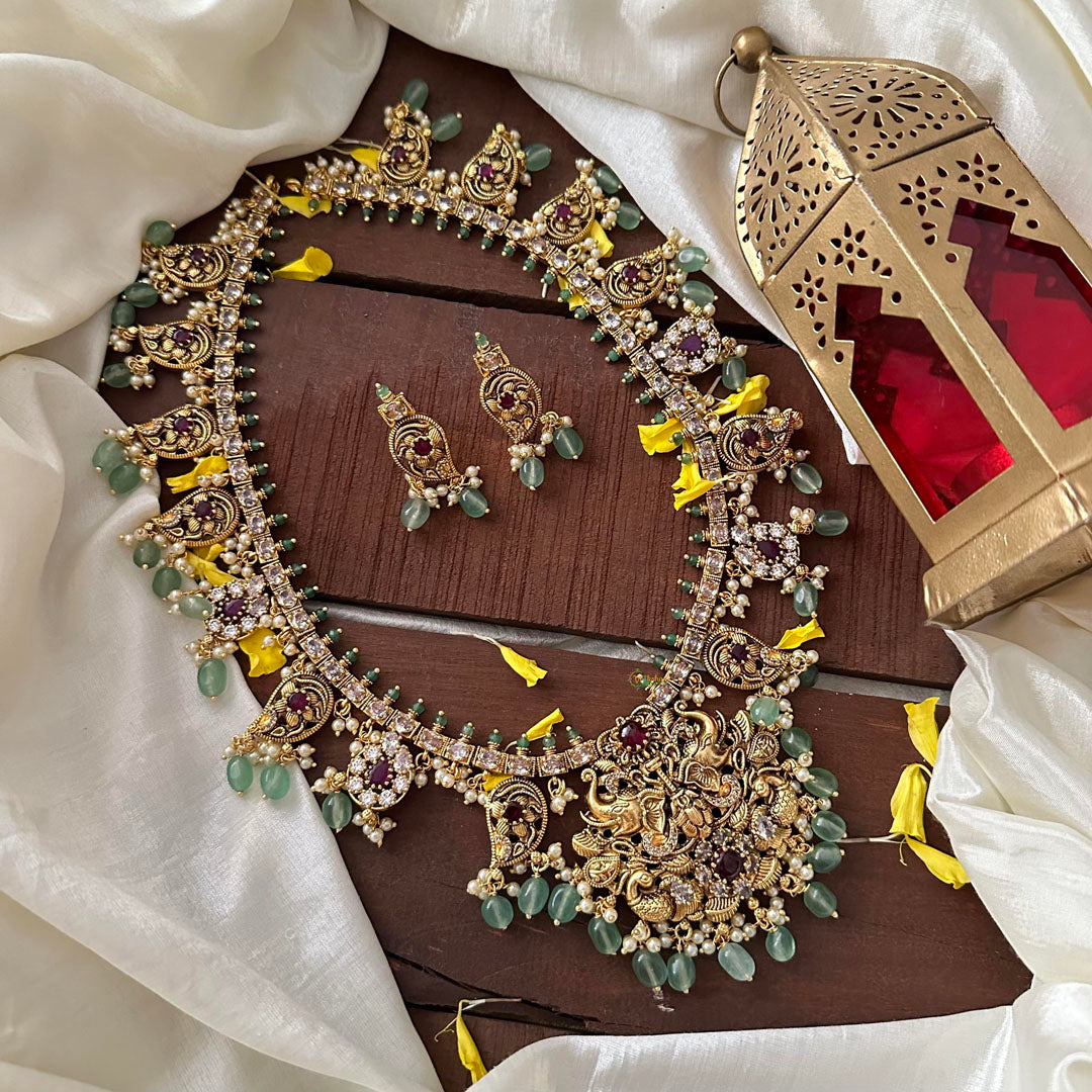 Indulge in the opulent sophistication of our Elegant AD Stone Elephant Long Neckpiece. Featuring an intricate design adorned with aqua green beads and sparkling AD stones, this necklace exudes luxury and elegance. Make a statement with this exclusive piece, perfect for any occasion.