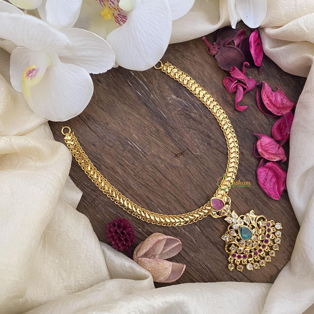 Indulge in the elegance of this red and green AD stone pendant neckpiece. Its short length adds a touch of sophistication while the micropolish finish adds a luxurious shine. Perfect for any occasion, this necklace is a true masterpiece that will elevate any outfit.
