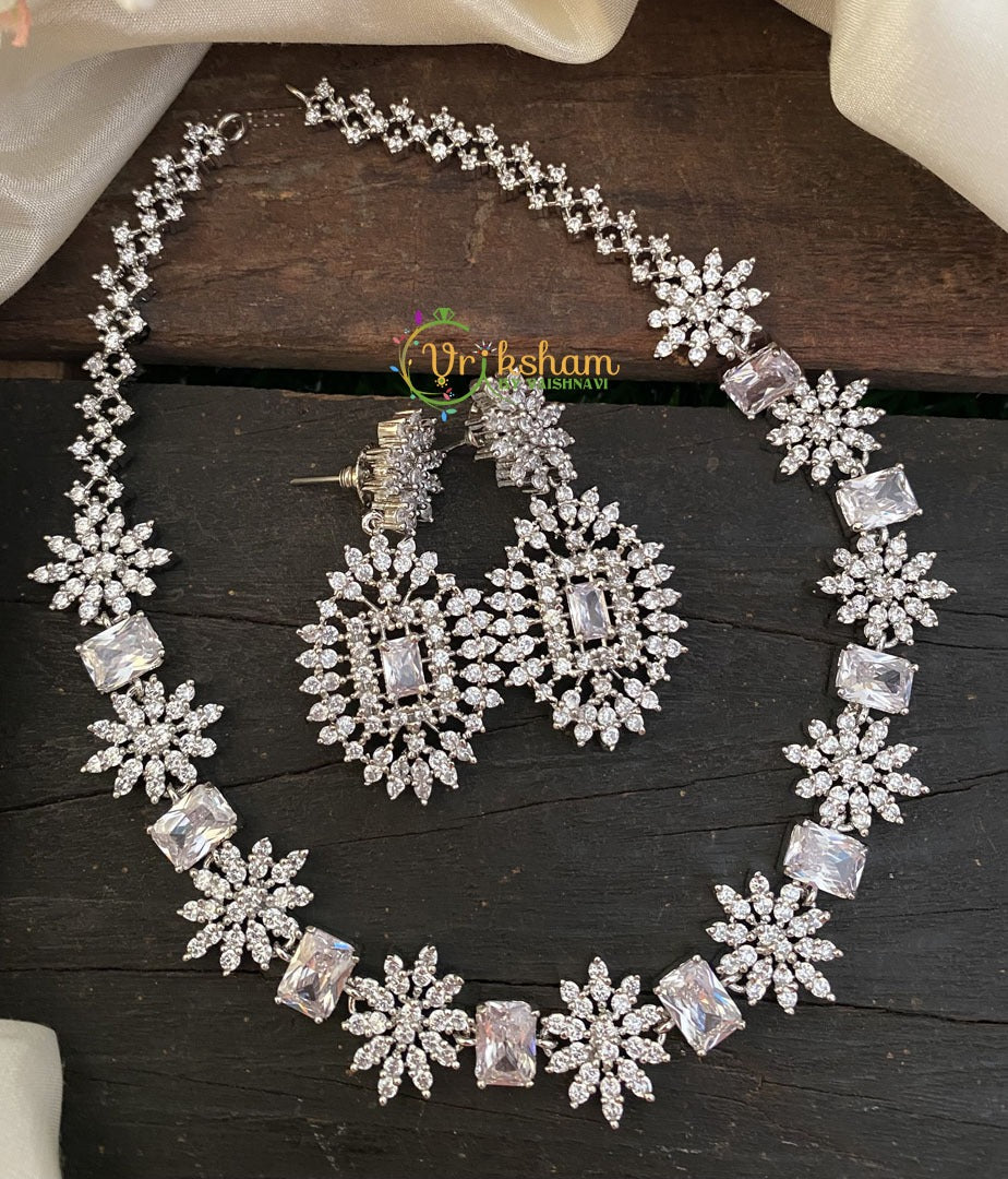 Elegant American diamond Choker Short Neckpiece- WHITE geometrical stones arranged with floral interludes; comes with matching earrings. SMALL SIZED NECKPIECE. SILVER TONE NECKPIECE.