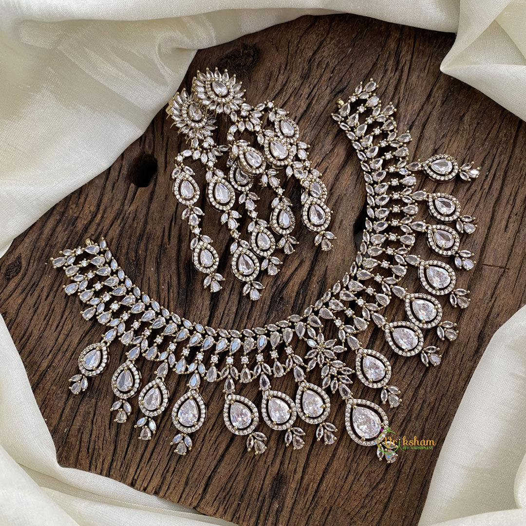 Victorian Diamond Pendant Short Neckpiece- white precious stone studded royal jewelry; comes with matching earrings.