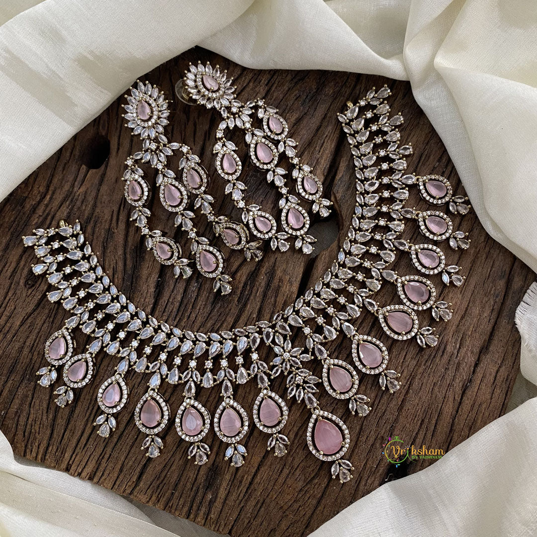 Elegant Bridal Victorian Diamond High Neck Choker Pastel Pink - Adorned with exquisite pastel pink and white diamonds and intricate detailing, our bridal jewelry is a tribute to the grace and sophistication of bygone times. From ornate necklaces to delicate earrings and enchanting tiaras, every piece is crafted to perfection, making it the perfect accompaniment to your special day. Elevate your bridal ensemble with our Victorian diamond jewelry ; comes with pair of matching earring.