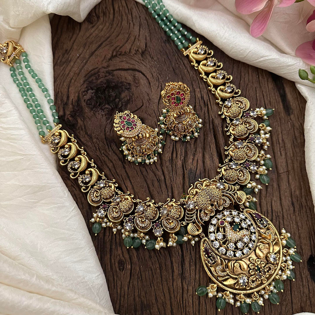 Unleash your inner goddess with our Elegant CZ Stone Peacock Long Neckpiece. Adorned with aqua green beads and pearls, this stunning necklace exudes elegance and sophistication. Complete the look with the matching earrings and make a bold statement wherever you go. Elevate your style and feel confident with our mesmerizing neckpiece!
