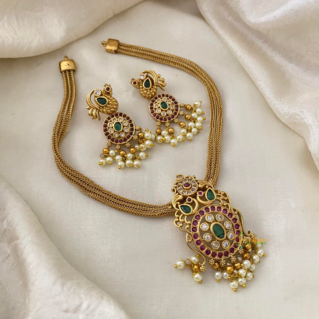 Elegant Dual Peacock AD Stone Pendant Addigai Choker - Elegant Dual Peacock AD Stone Pendant Addigai Choker. Addigai which follows the design of floral like structure in center whereas on top there are dual peacock and touch of green color stone. Finishing is given with white, golden pearls and small detailing flowers are present in end to join pearls with pendant to make more stunning for your special occasion. Addigai short neckpiece, comes with matching earrings.
