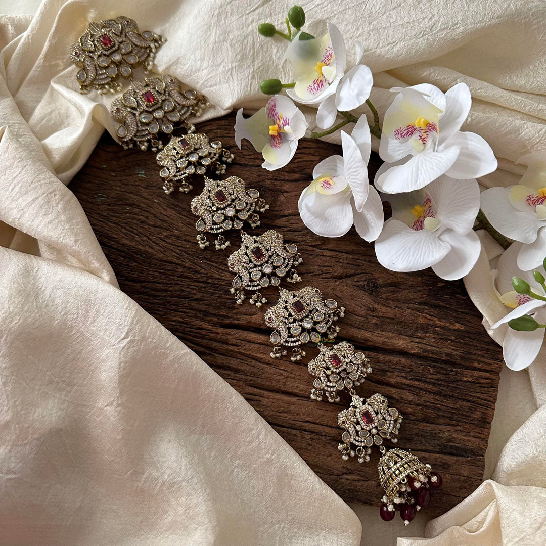 Embrace luxury with our Elegant Elephant Victorian Diamond Bridal Jada featuring dual pendants adorned with sparkling diamonds and a stunning red center stone. Exude sophistication and elegance with this exclusive piece, making a statement at any occasion. Elevate your style with our Jada Billai-Red-Pearl-VV1656.