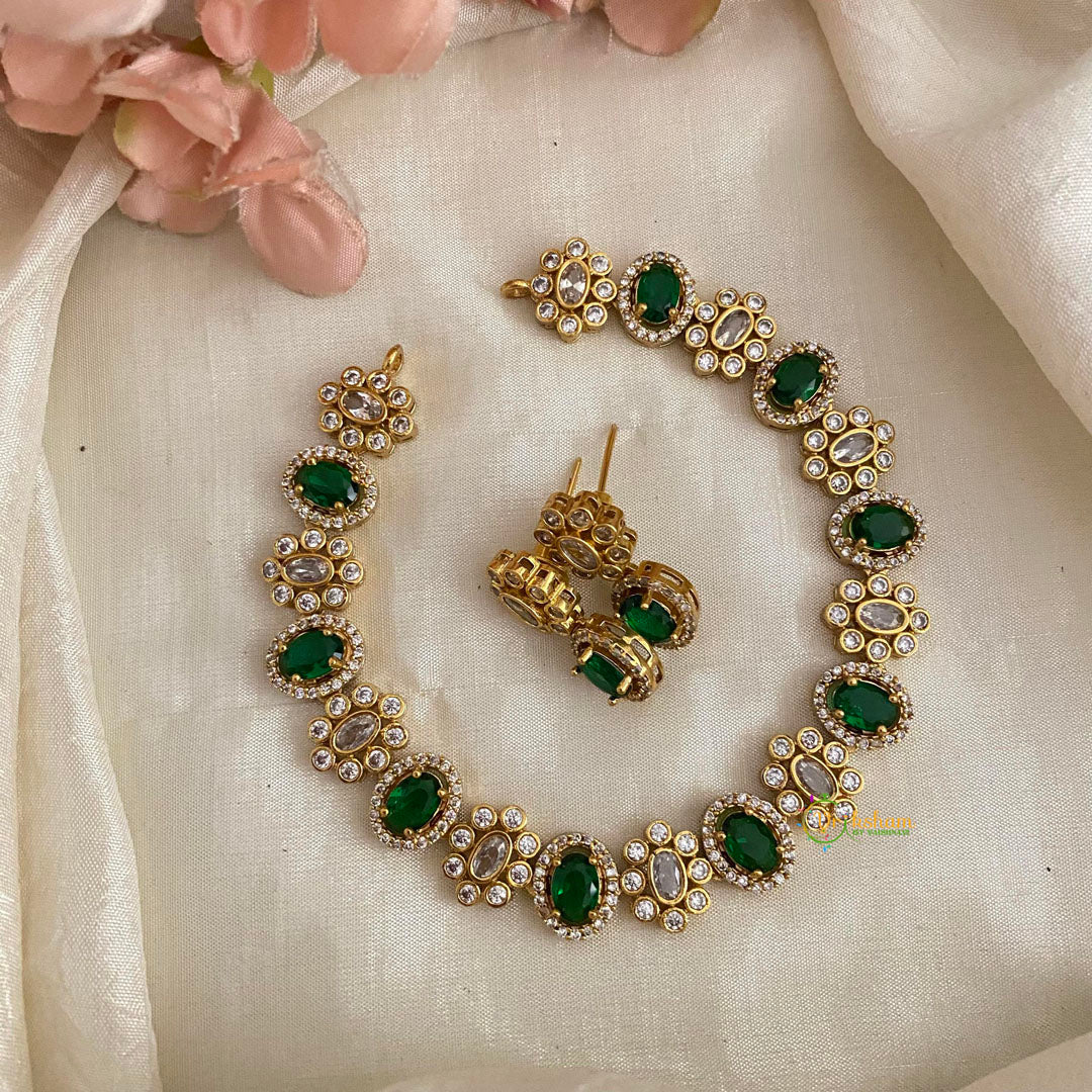 Elegant Floral Short Choker Neckpiece-Green- Premium gold look alike patterned short pendant neckpiece with earrings.