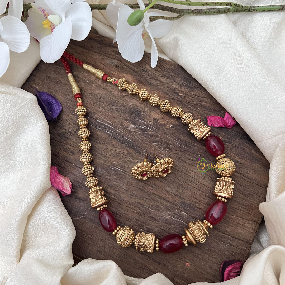 Indulge in luxury with our Elegant Gold Alike Beaded Mala, adorned with stunning maroon beads. This exquisite piece comes with matching earrings for a complete and elegant look. Crafted with intricacy and sophistication, it is the perfect accessory for formal events or to add a touch of opulence to any outfit. Elevate your style with this exclusive mala.