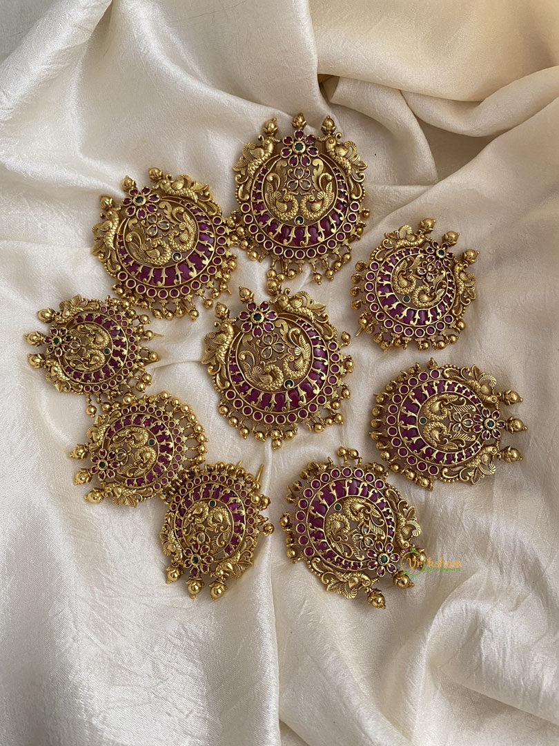 Elegant Gold Look Alike Dual Peacock Jada Billai - 9 pieces of same size temple billai - The Gold Look Alike Dual Mayil in center and dual mayil on top Jada Billai with Ghungroo and with touch of red non precious kemp stone is a striking hair ornament that combines elegance with traditional Indian charm. Surrounding the central motif are two additional peacocks adorning the top of the ornament, enhancing its visual appeal and symmetry. The intricate detailing captures the intricate patterns of feathers and delicate features of the peacock, adding a touch of sophistication to any hairstyle.