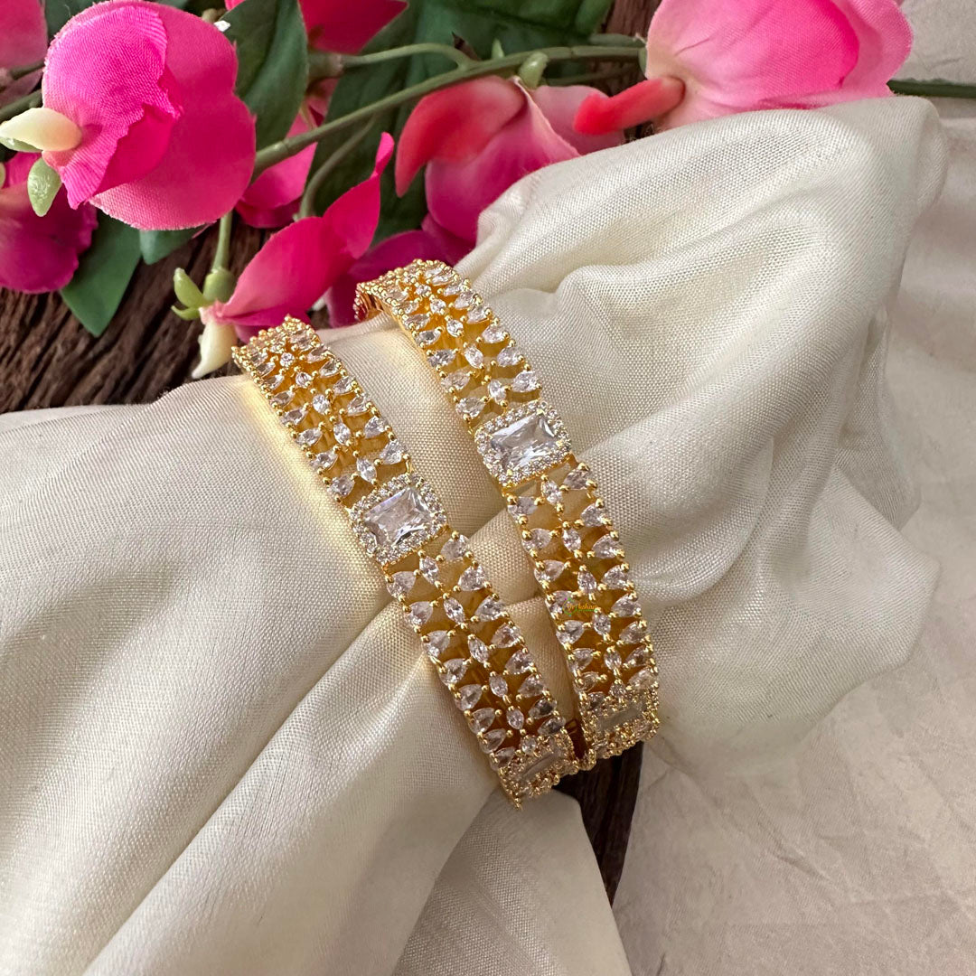 Add a touch of luxury to your look with our Elegant Gold Look Alike White AD Stone Bangle. This exquisite pair of bangles features intricate details and sparkling white AD stones that will elevate any outfit. Perfect for adding glamour and sophistication to your style. Comes as a pair for a complete and elegant look.