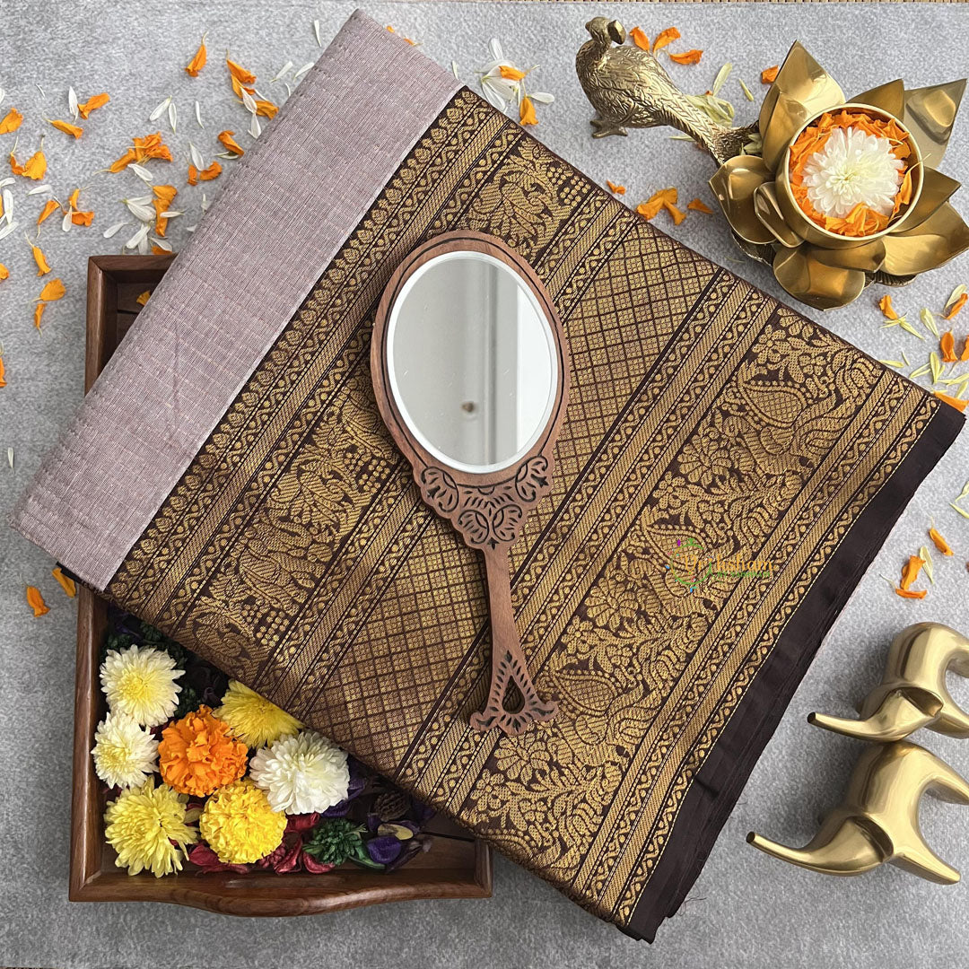 Elegant Grey Kanchi Cotton Saree with Thick Golden Border -Handloom - Drape elegance - IThe Graceful Grey Kanchi Cotton Saree with Golden Border is a timeless masterpiece crafted through intricate handloom techniques. Its soft, breathable cotton fabric makes it comfortable to wear in any season, while its elegant grey hue exudes sophistication. Suitable for both cultural celebration and casual outing.