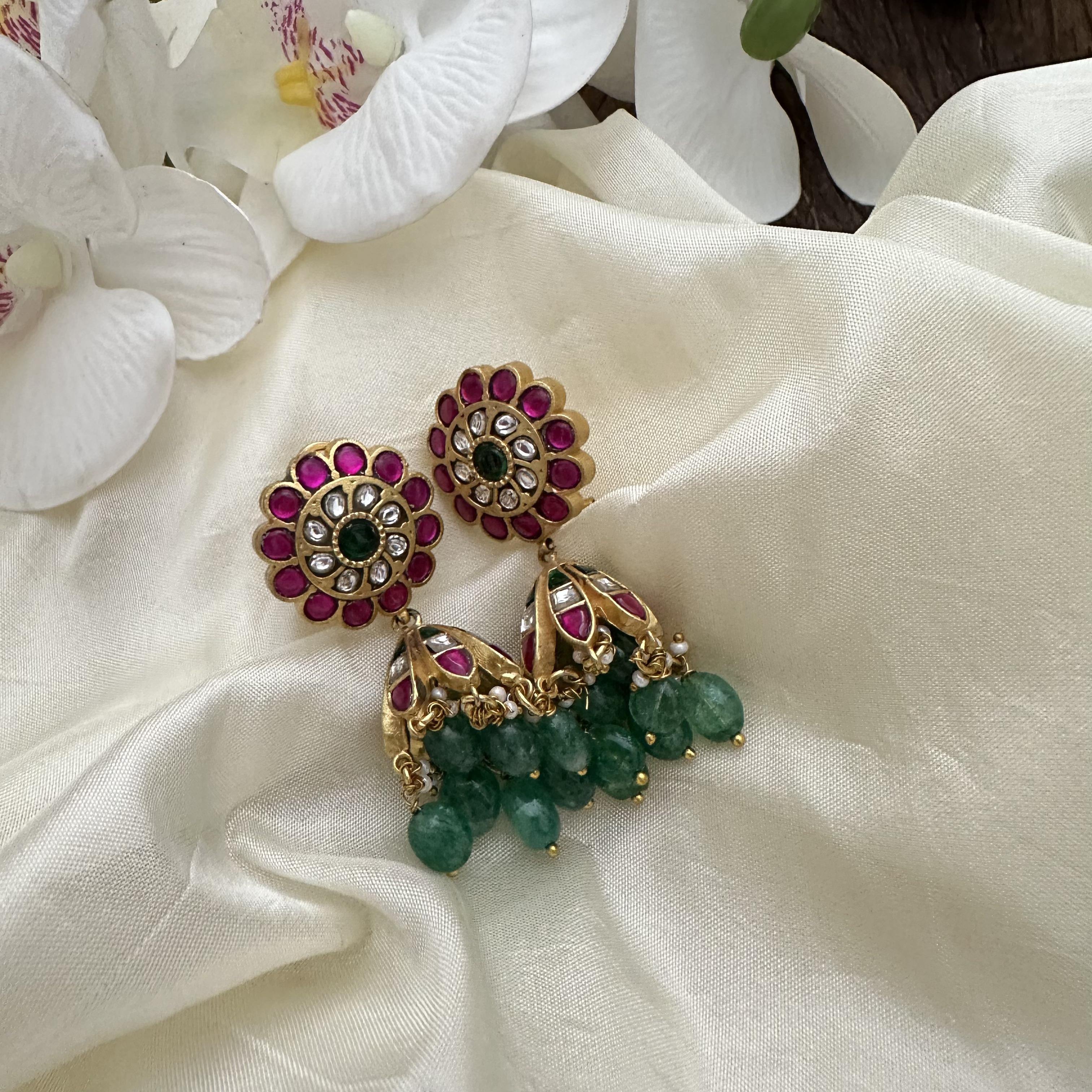 MAKE MATERIAL – Jadau Kundan Jhumkas , kundan jewelry is made of copper and brass and has precious stones, pearls and beads
