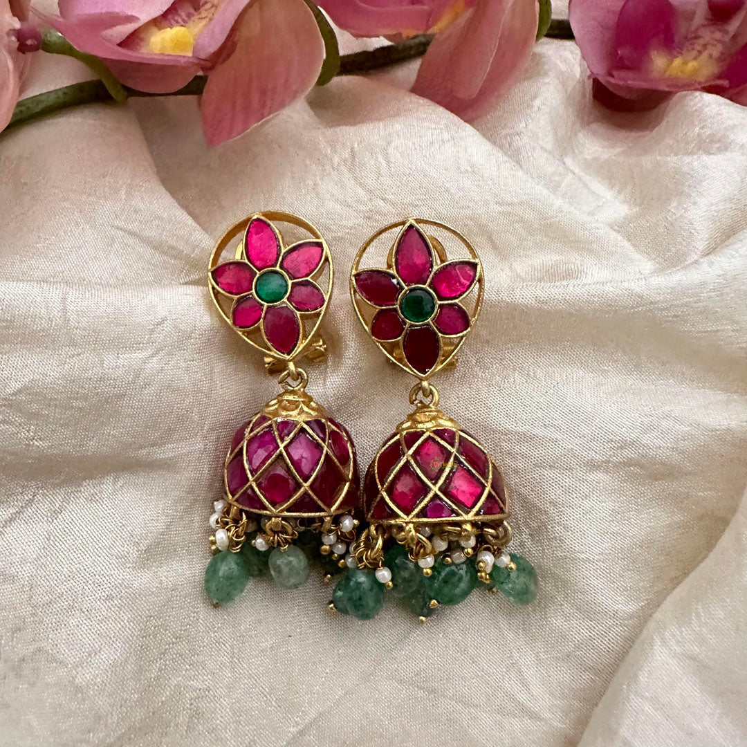 Elevate your style with our Elegant Jadau Kundan Jhumkas! Adorned with pastel green beads and pearls, these earrings add a touch of sophistication to any outfit. Handcrafted with intricate traditional design, each piece is a work of art. Upgrade your jewelry collection with these beautiful jhumkas! The back screw design ensures a secure and comfortable fit.