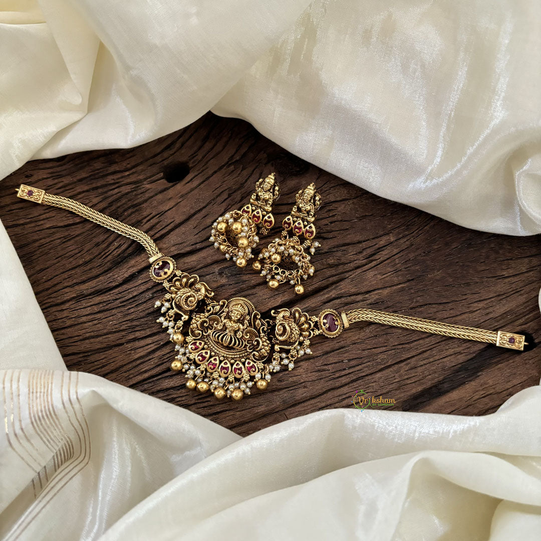 Elegant Lakshmi Pendant High Neck Choker-Red AD stone studded premium quality high neck choker; gold bead finish . Comes with matching ear hangings.