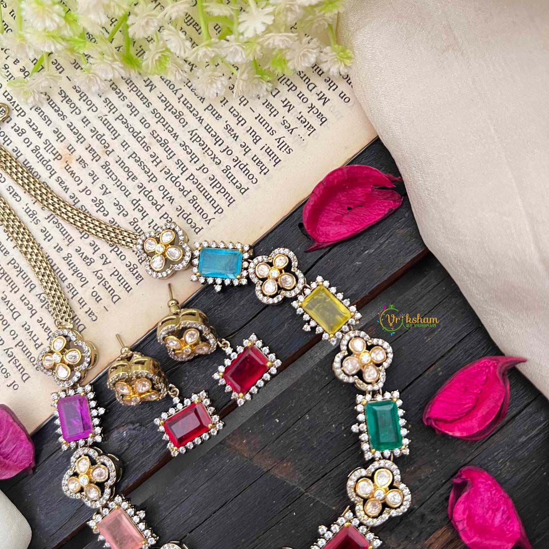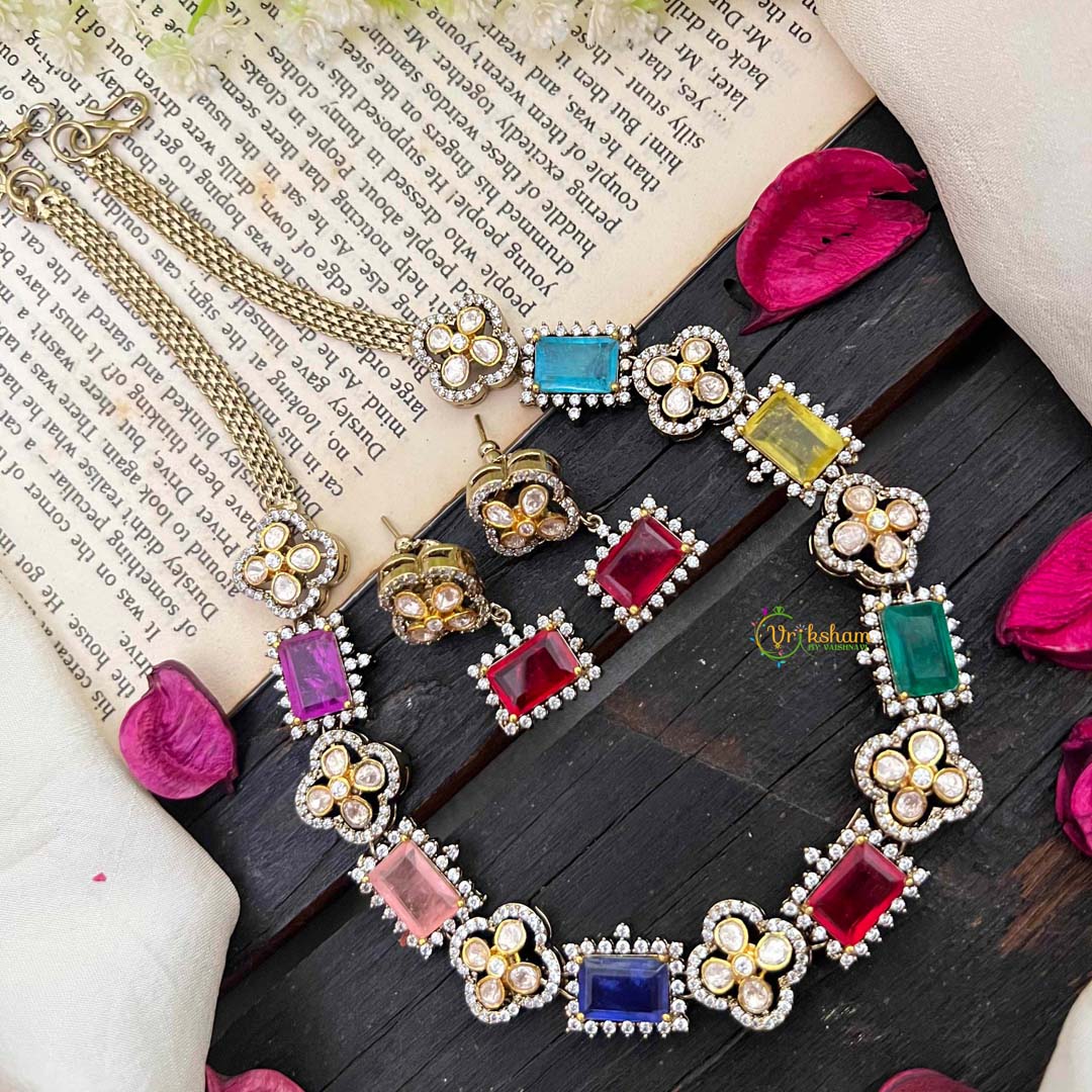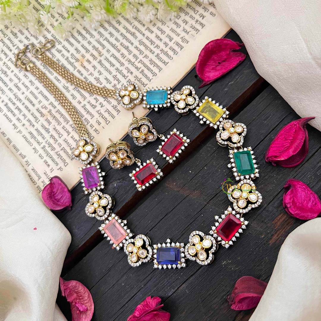 Indulge in pure luxury with our Elegant Navrathna Victorian Diamond Neckpiece. Crafted with exquisite attention to detail, this stunning piece features sparkling diamonds set in a stunning navrathna Victorian design. Elevate any outfit and make a statement of elegance with this exclusive neckpiece.