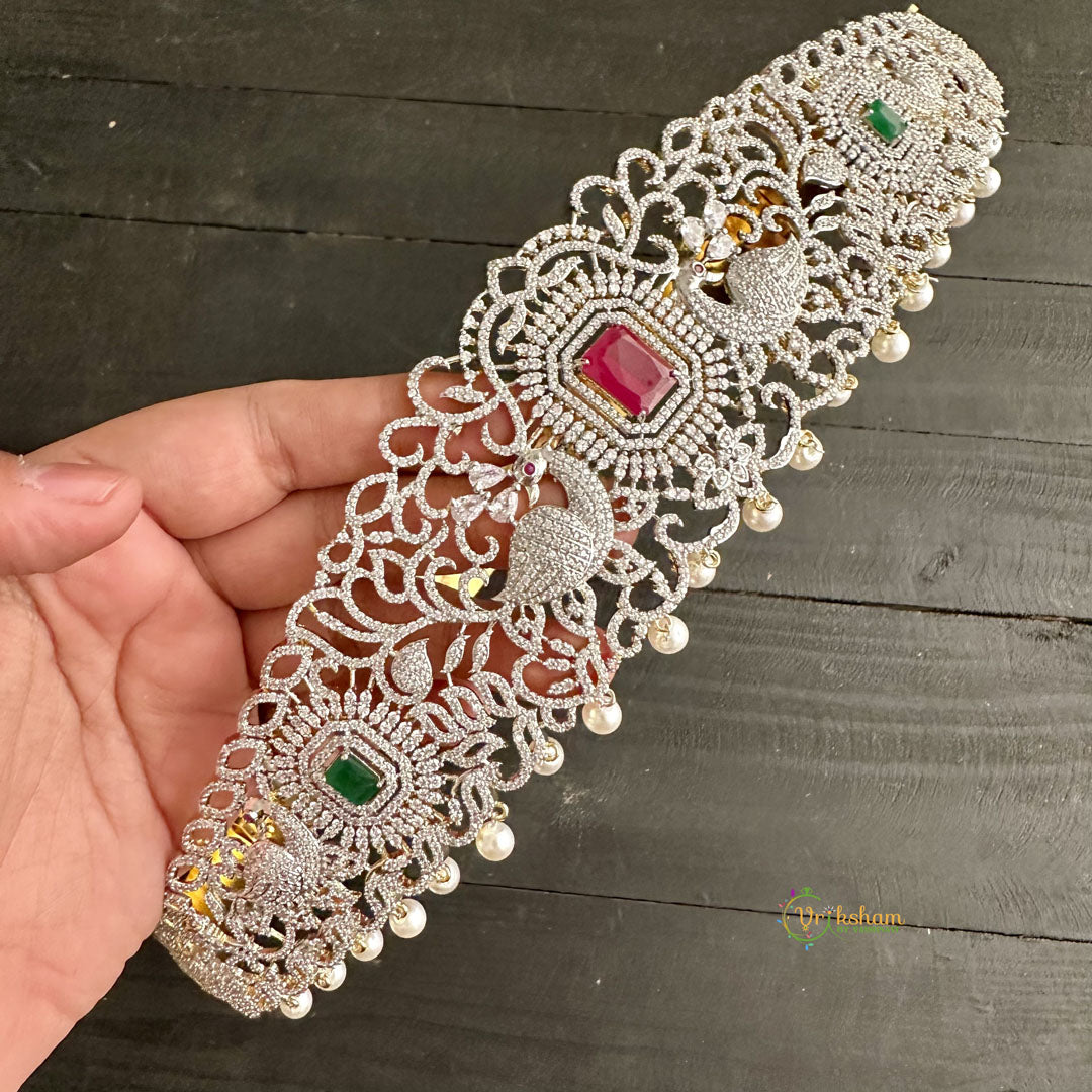 Elegant Peacock Bridal American Diamond Hipbelt - Green & Pink - The Elegant Peacock Bridal American Diamond Hipbelt with Pearls is a breathtaking fusion of elegance and sophistication, perfect for adding a touch of glamour to any bridal ensemble. Inspired by the majestic beauty of peacocks, this hipbelt features intricately designed motifs adorned with shimmering American diamonds and pearl finish that sparkle with every movement. Made for wedding and festive occasions. Premium finish hip belt.