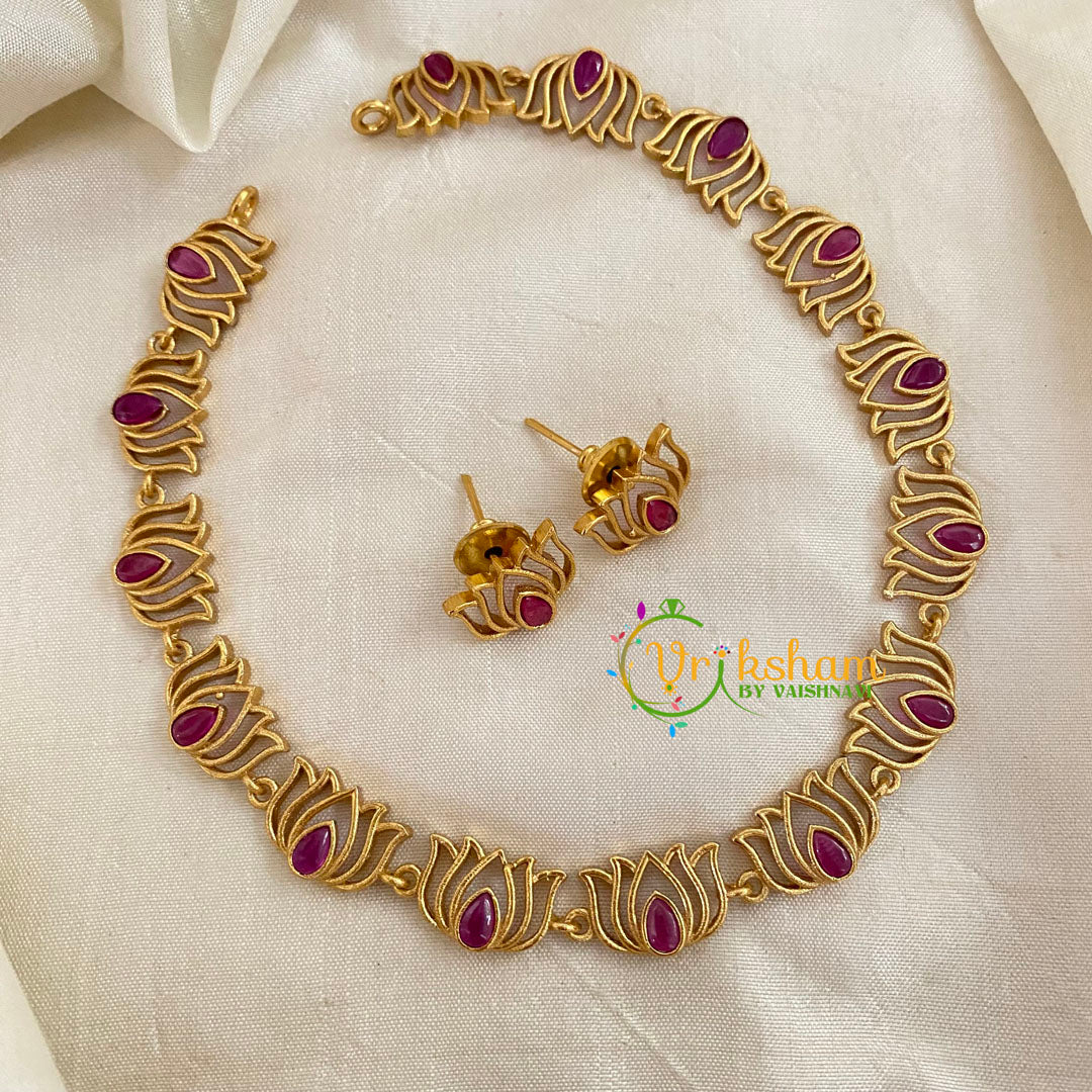 Lotus AD Stone Choker Short Neckpiece- red AD stone lotus patterned choker with earrings.