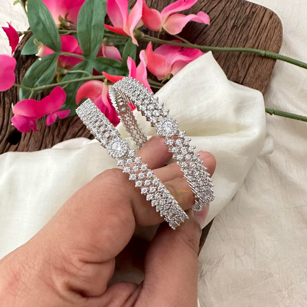 Indulge in luxury with our Elegant Silver Look Alike AD Stone Bangle. Made with premium materials, this pair of bangles exudes sophistication and elegance. Adorned with sparkling white AD stones, they are a perfect complement to any outfit. Elevate your style game with this exclusive piece.
