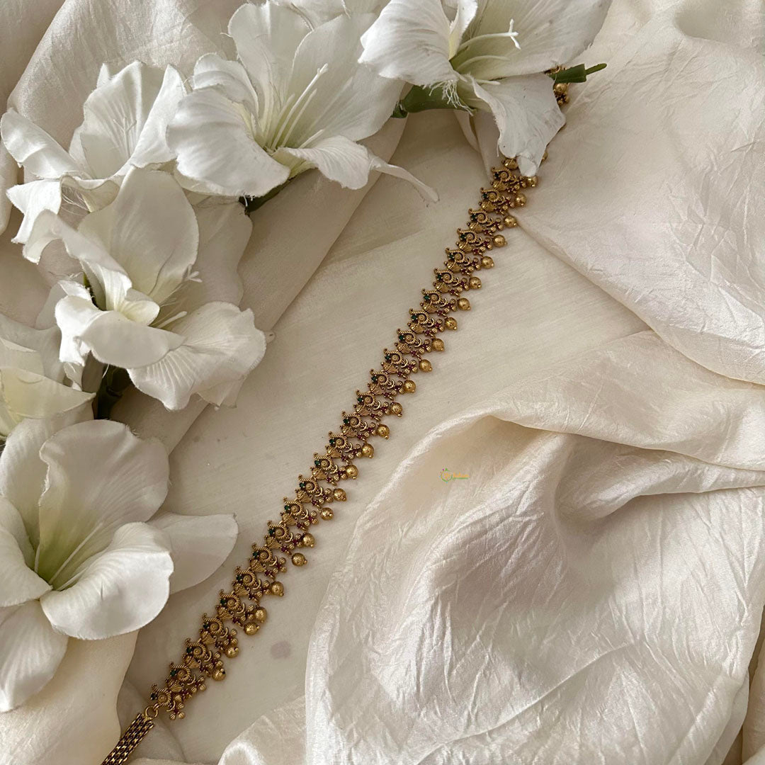 Elegant Thin Hip Chain - Gold is a gold look alike Hip belt. Floral drops pattern and has ghungroo finish; no pearls with touch of red and green stones.This gold hip chain adorned with delicate floral and peacock designs adds a touch of elegance to any outfit. Its slim design accentuates your curves, making you feel confident and stylish. Perfect for special occasions or everyday wear, this chain is a must-have for any fashion-forward individual.