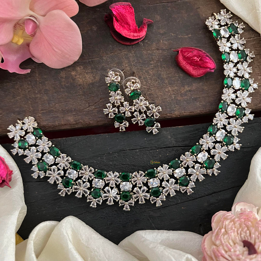 Add a touch of elegance to your wardrobe with our Victorian Diamond Choker. Adorned with green and white stones, this choker is perfect for any occasion. Its timeless design and exquisite detailing make it a must-have for any jewelry collection. Elevate your style with this stunning piece. Comes with matching earrings.