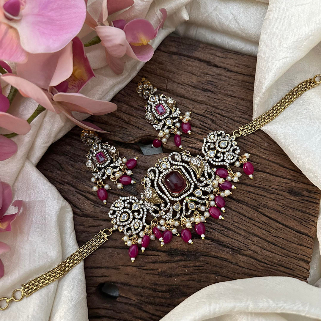 Add a touch of elegance to your jewelry collection with our Victorian Diamond Dual Peacock Addigai. This stunning piece features intricate diamond detailing and vibrant red beads, making it the perfect accessory for any special occasion. Elevate your look and feel confident in your style. Comes with matching earrings.