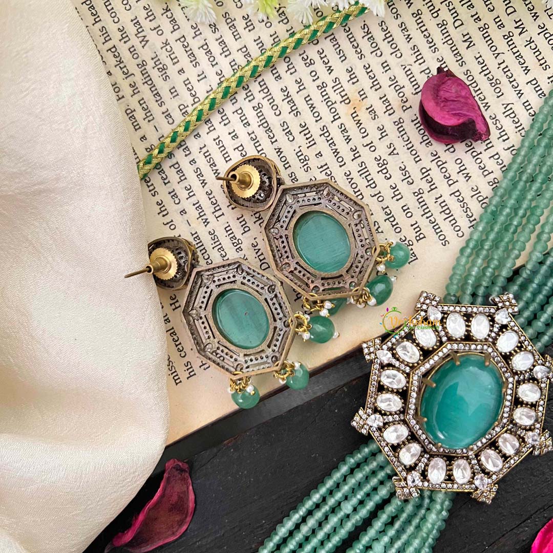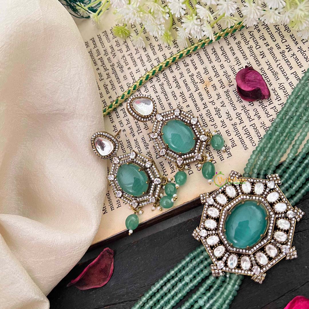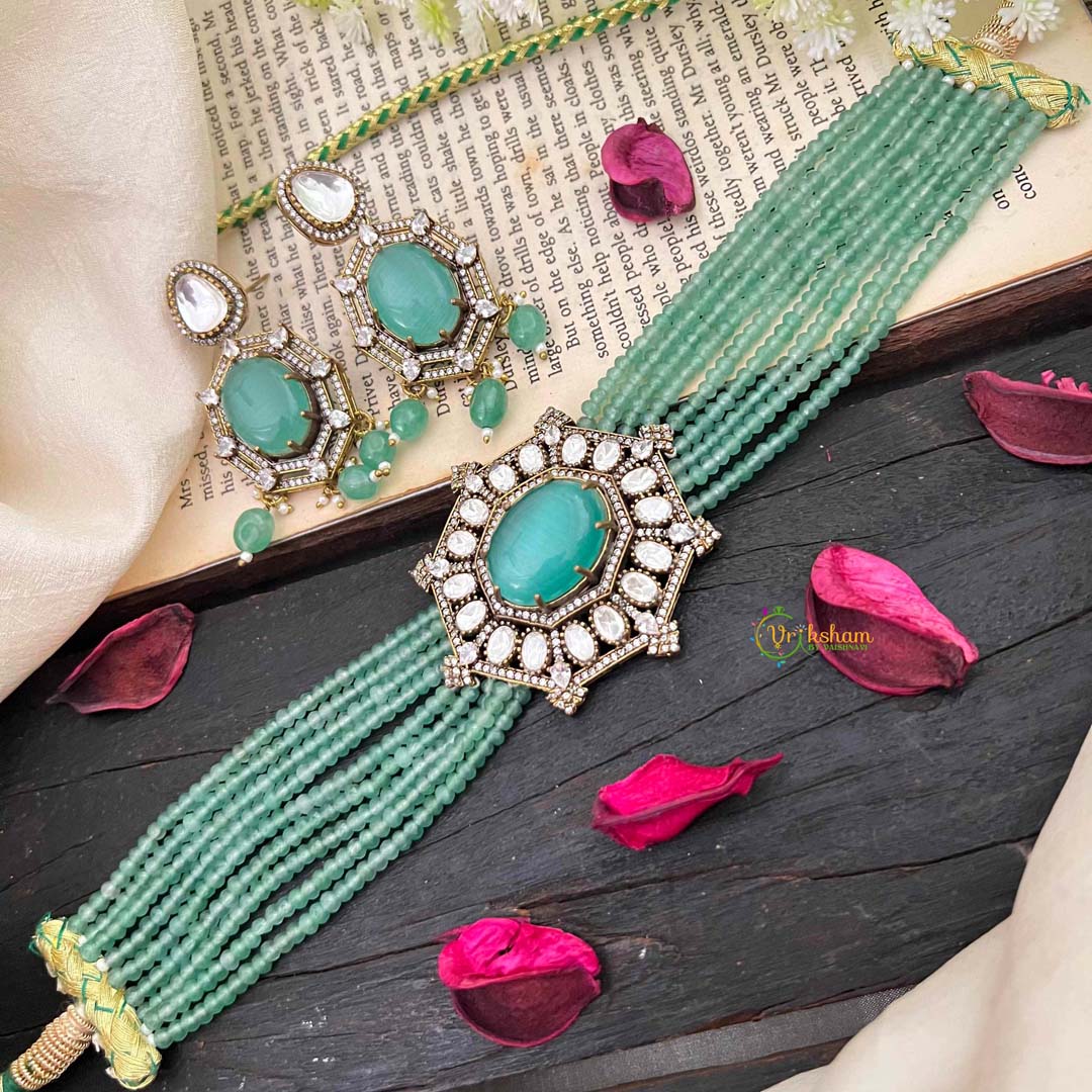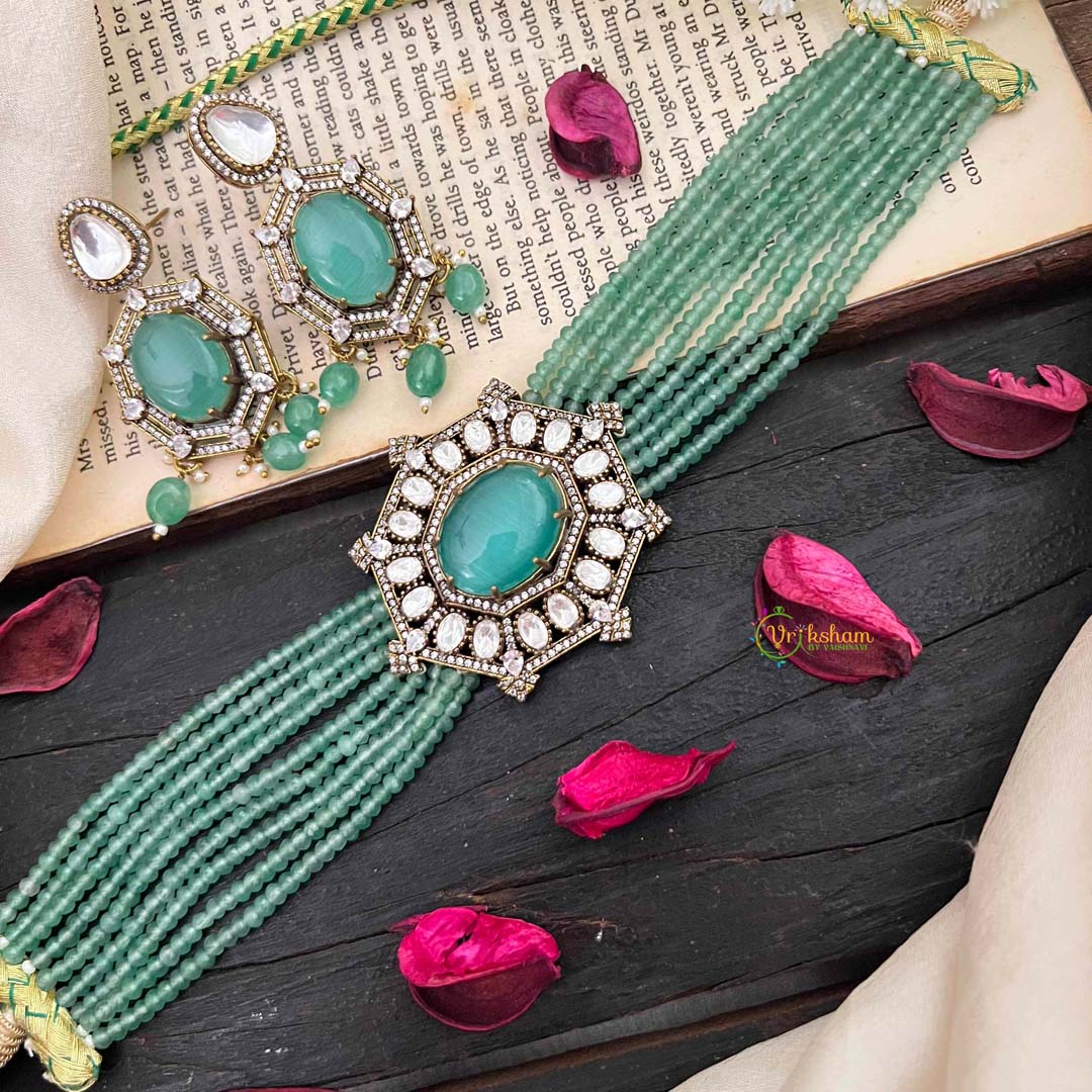 Elevate your style to a new level of elegance with our Victorian Diamond Layered High Neck Choker in Aqua Green. Adorned with stunning diamond beads and a focal center stone, this choker is a luxurious statement piece that will bring a touch of sophistication to any outfit.