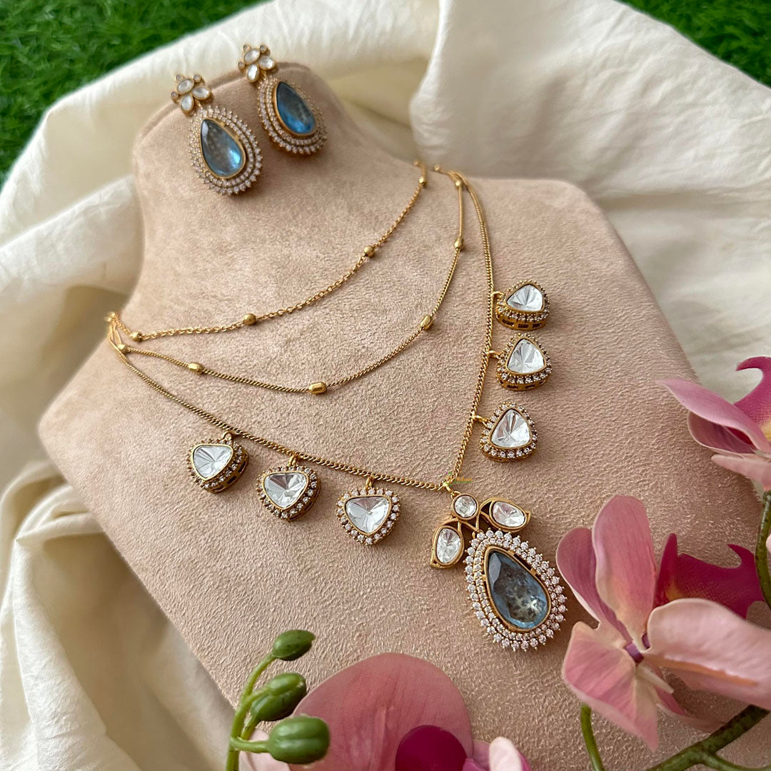 This Elegant Victorian Diamond Tear Drop Pendant Chain Nachpiece in Pastel Green is the perfect statement piece for any outfit. The sparkling diamond tear drop pendant adds a touch of elegance, while the vibrant green color brings a pop of color. It is a must-have for any fashion-forward individual looking to make a stylish statement. Comes with matching earrings.