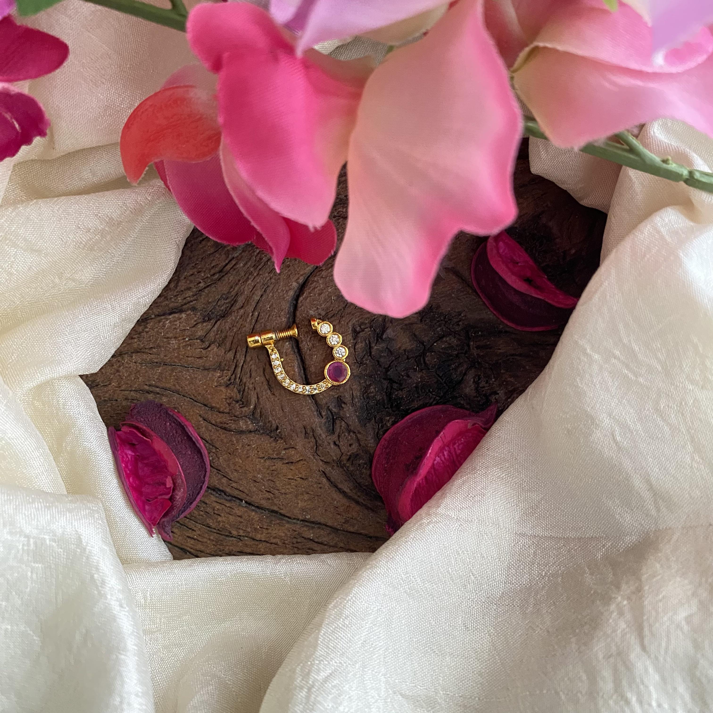 Elevate your style with our exquisite Designer AD Stone Nath / Nose pin. Featuring intricate designs and stunning AD stones in vibrant red, this piece is a must-have for any fashion-forward individual. Perfect for adding a touch of luxury and sophistication to any outfit.