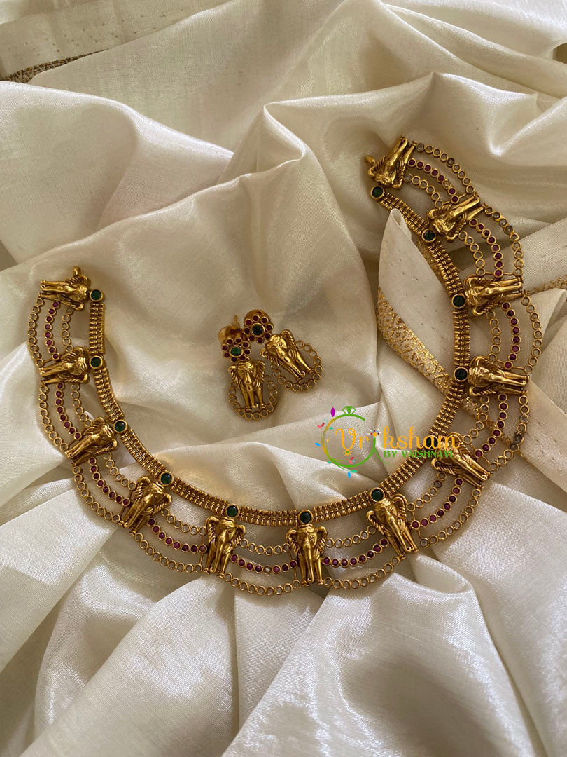 Premium Elephant Choker Short Neckpiece -No pearl neckpiece; whiteand red AD stone and elephant patterned choker with earrings.