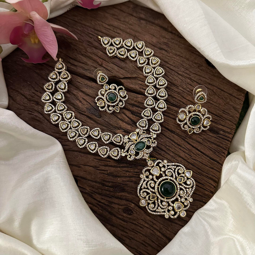 Elevate your style with our Exclusive 2 Layer Victorian Diamond Long Neckpiece. This stunning piece features a beautiful embered green precious stone at its center, surrounded by sparkling white stones. The perfect accessory to add a touch of elegance to any outfit.Comes with matching earrings.