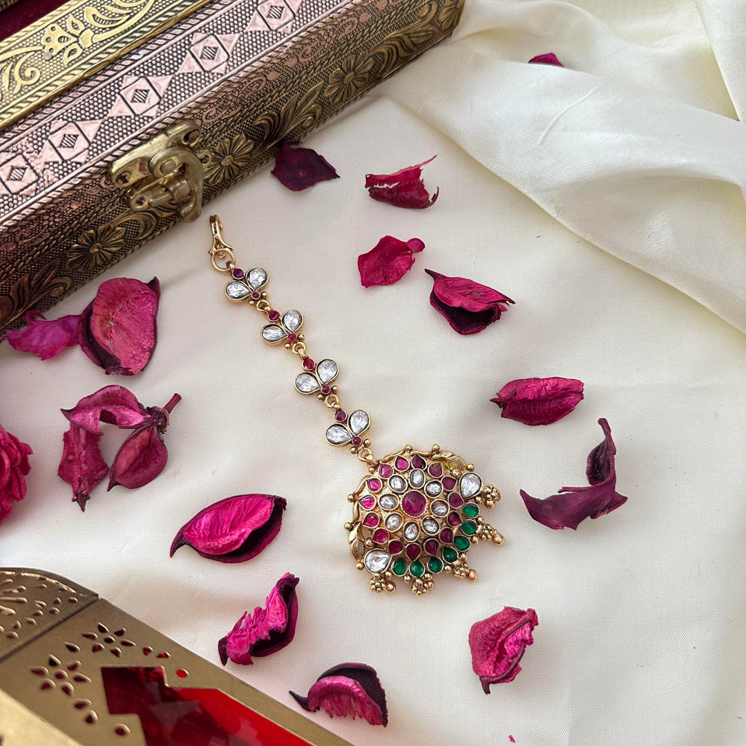 Add a touch of luxury to your look with our Exclusive AD Stone Maang Tikka. Made with 1 gm of pure gold and adorned with exquisite AD stones, this statement piece will elevate any outfit and make you feel like royalty. Perfect for weddings, parties, and special occasions.