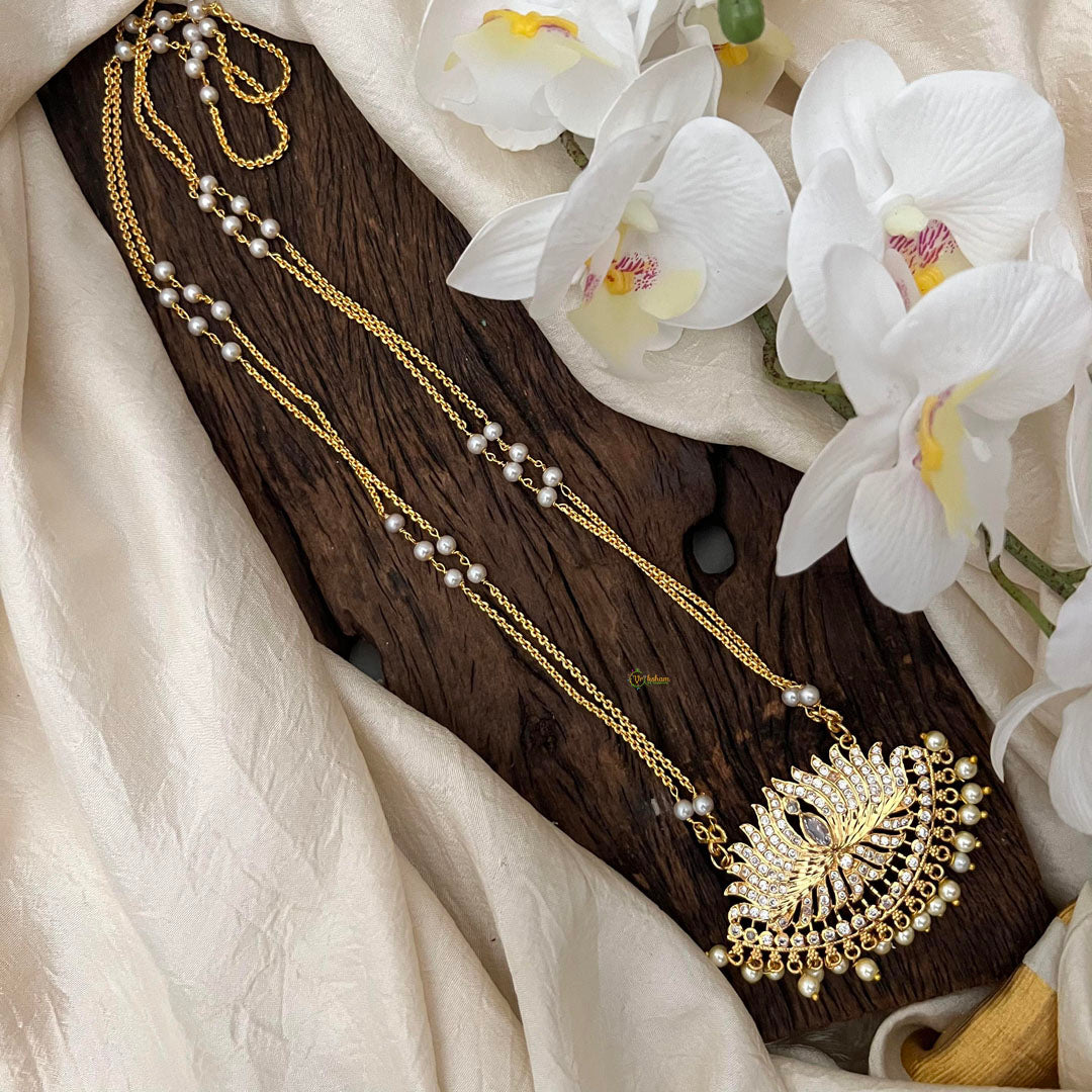 This exquisite lotus pendant chain exudes a vintage charm with its 90's style and white AD stones. Adorned with a lustrous pearl, this exclusive piece is a symbol of grace and elegance. Elevate your style with this timeless accessory.