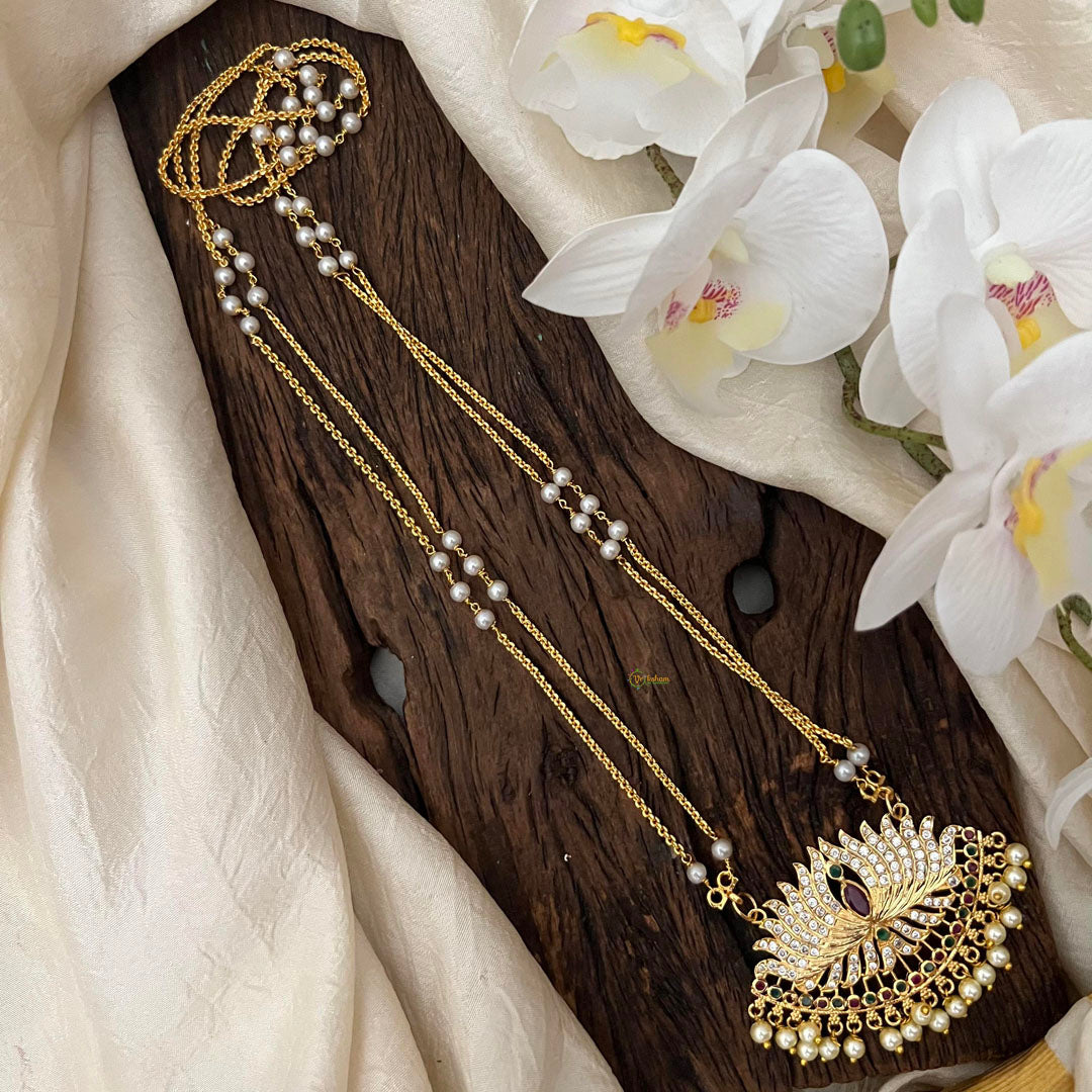 This exquisite lotus pendant chain exudes a vintage charm with its 90's style and vibrant red and green AD stones. Adorned with a lustrous pearl, this exclusive piece is a symbol of grace and elegance. Elevate your style with this timeless accessory.