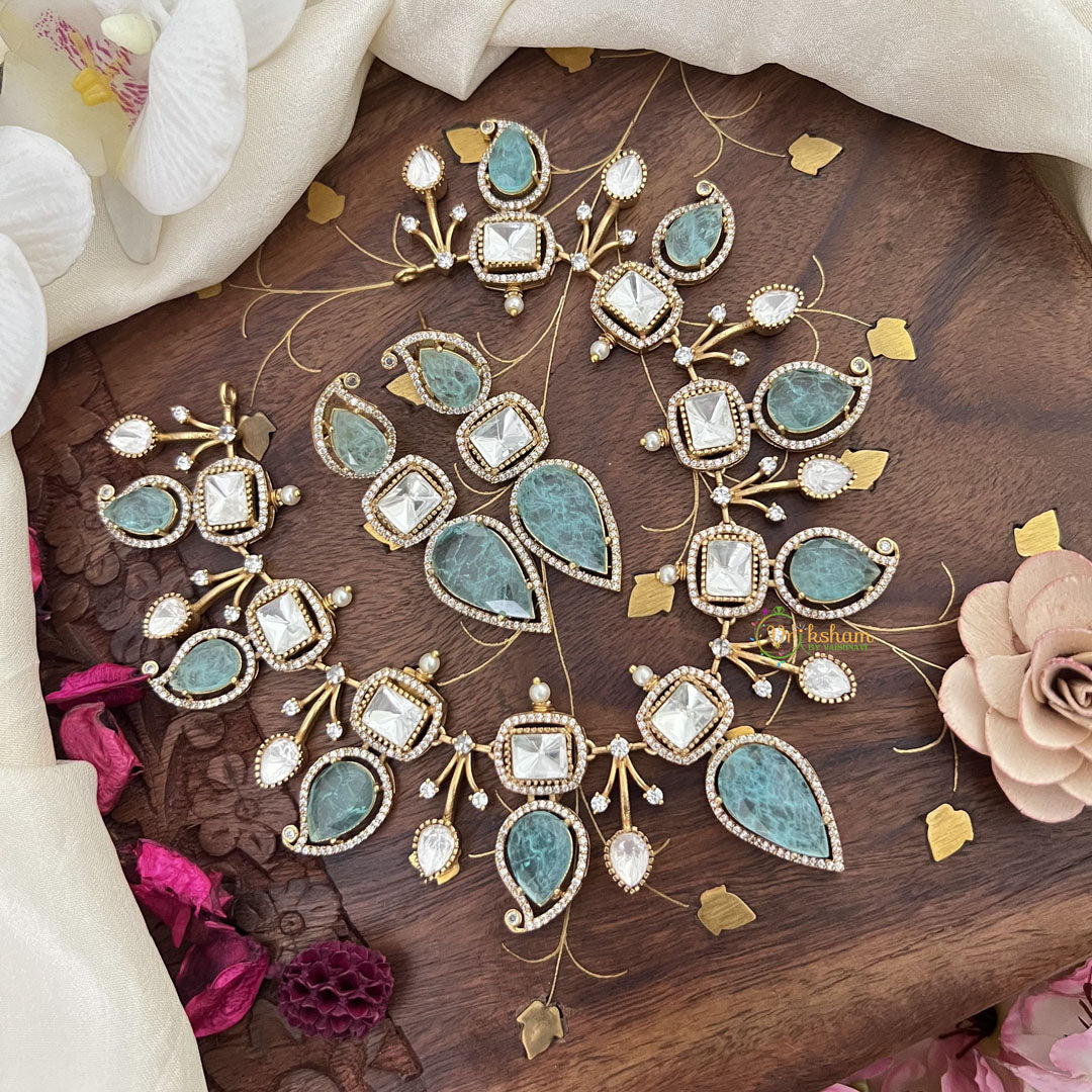 Indulge in the opulent elegance of our Exclusive Aqua Blue Victorian Diamond Short Neckpiece. This exquisite neckpiece boasts a stunning design adorned with dazzling diamonds, exuding luxury and sophistication. Elevate any outfit with this must-have statement piece, exclusively available in our collection.