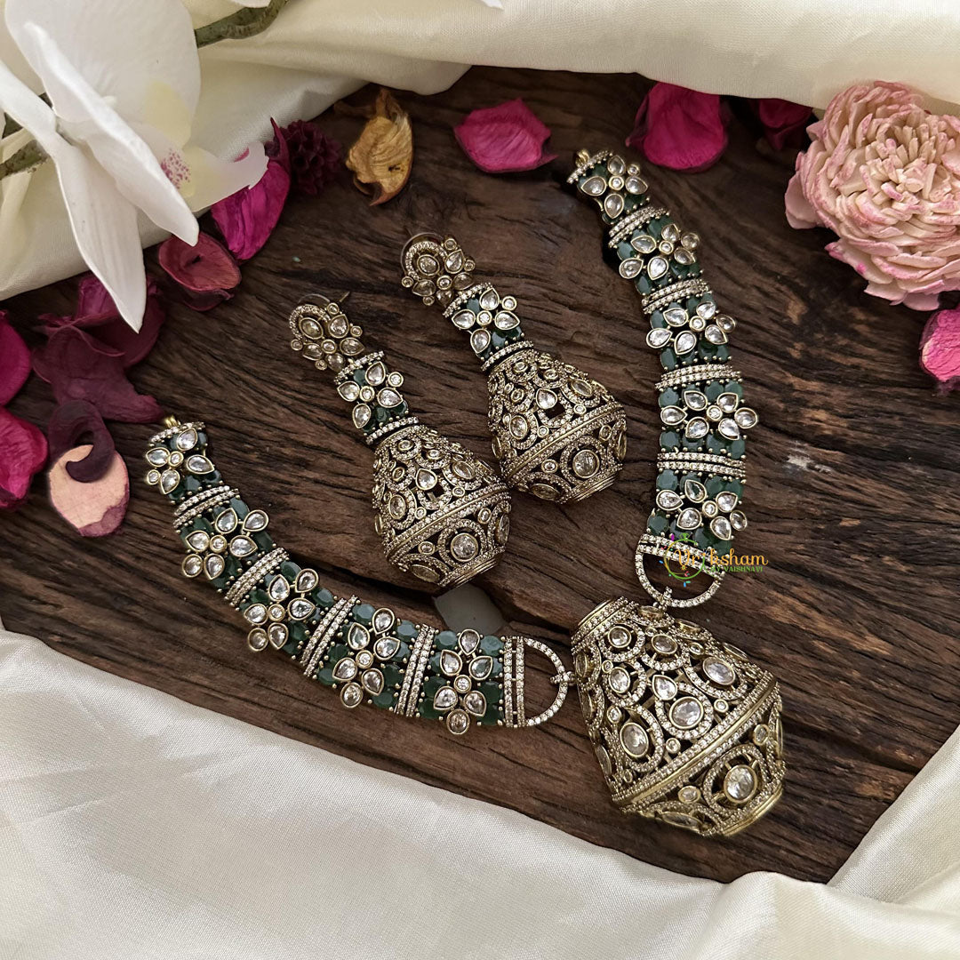 Indulge in opulent luxury with our Exclusive Green Victorian Diamond Hasli. A true statement piece, this diamond-studded necklace exudes elegance and sophistication. The unique green diamond adds a touch of rarity and exclusivity, perfect for the tasteful and refined individual. Own a piece of art with our Hasli.