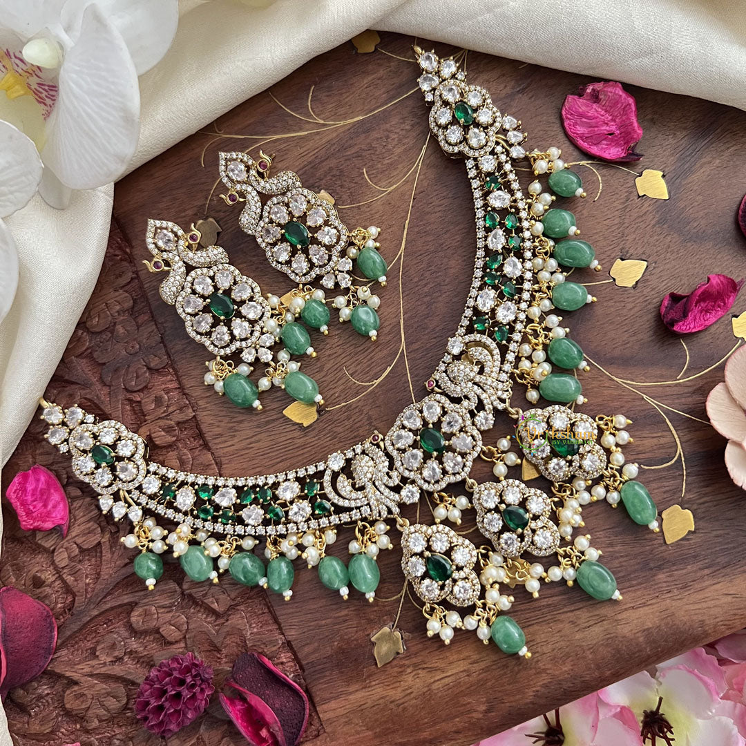 Introducing our exclusive Hasli Victorian Diamond Neckpiece, adorned with two elegant side peacocks. This stunning piece exudes luxury and sophistication, with its intricate design and sparkling diamonds. Elevate any outfit and make a statement with this one-of-a-kind neckpiece. Available in a beautiful shade of green.