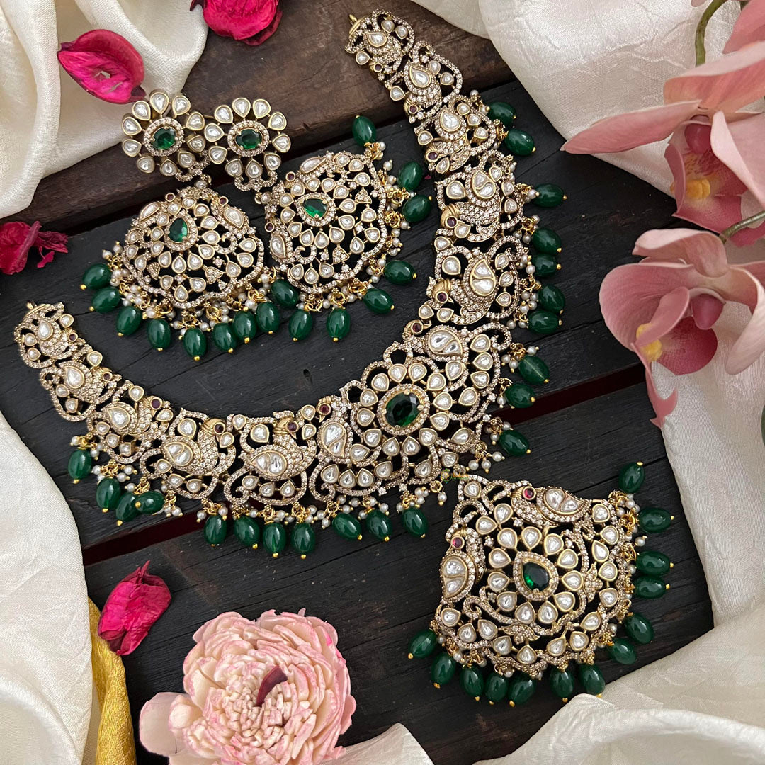 Elevate your style with our Exclusive Victorian Diamond Pendant Choker. Adorned with a beautiful bird design and intricate diamond work, this choker adds a touch of elegance to any outfit. The finishing touch of green beads adds a pop of color and makes it a true statement piece.Comes with matching earrings.