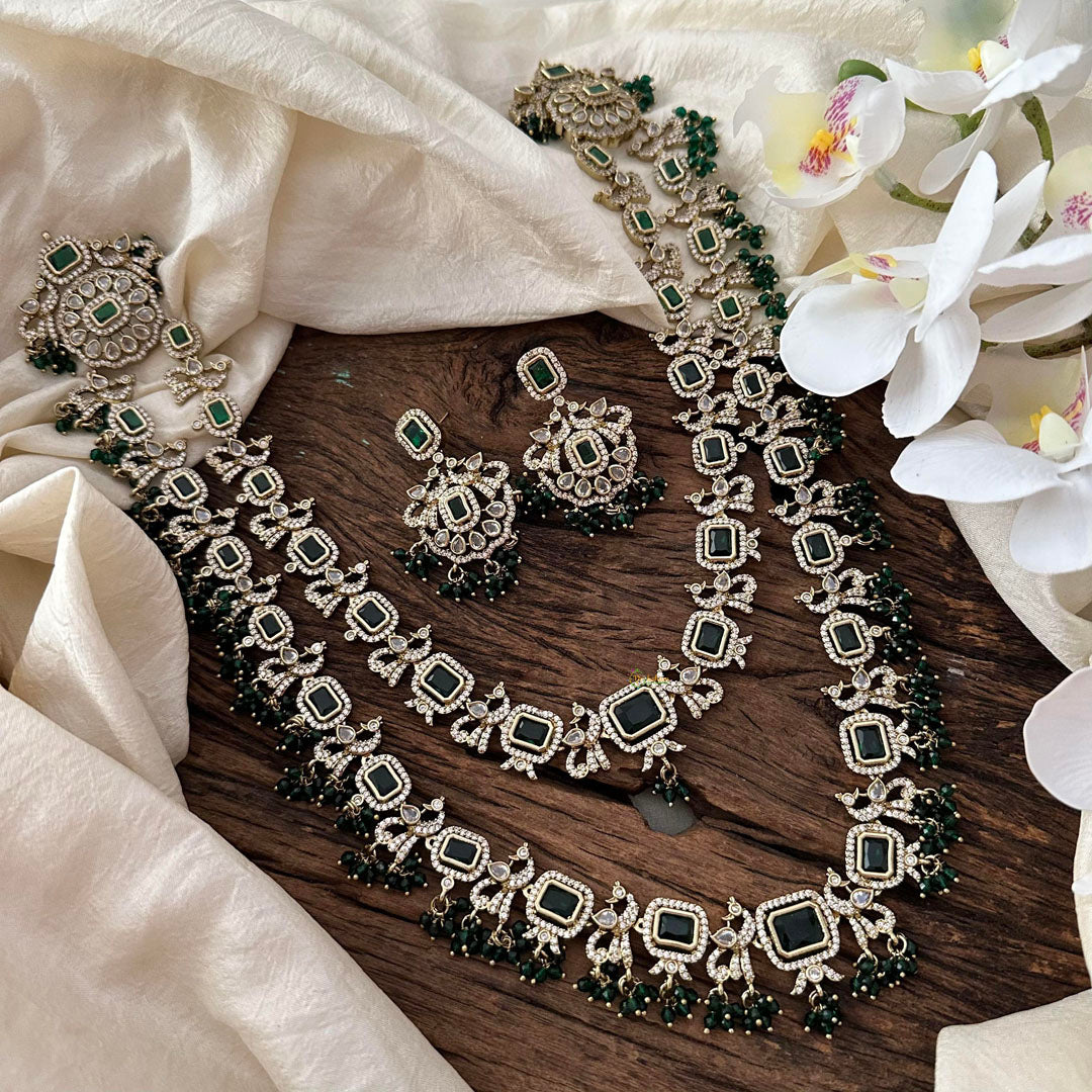 Indulge in luxury with our Exquisite 2 Layer Victorian Diamond Long Neckpiece. Adorned with green beads and featuring an intricate bird design, this elegant accessory is a must-have for those who appreciate sophistication and exclusivity. Elevate your look with our green neckpiece that exudes timeless elegance and grace. Comes with matching earrings.