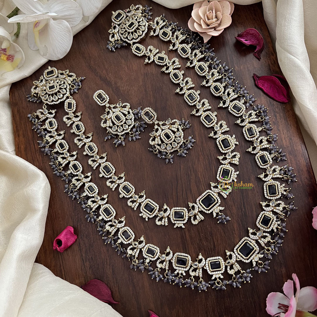 Indulge in luxury with our Exquisite 2 Layer Victorian Diamond Long Neckpiece. Adorned with purple beads and featuring an intricate bird design, this elegant accessory is a must-have for those who appreciate sophistication and exclusivity. Elevate your look with our purple neckpiece that exudes timeless elegance and grace. Comes with matching earrings,