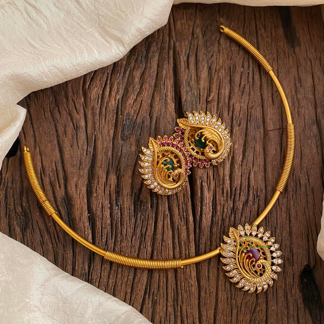 Exquisite AD Stone Pendant Hasli Choker- Exquisite gold look alike red, green, white AD Stone studded Hasli Choker short neckpiece With Matching Stud Earrings.