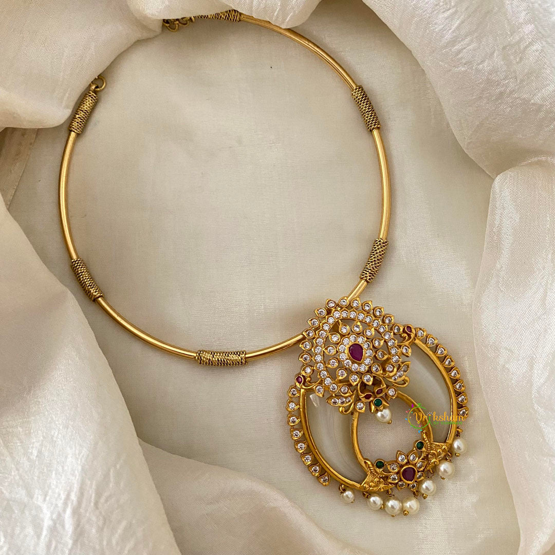 Exquisite AD Stone Pendant Hasli Choker- Exquisite gold look alike red, green, white AD Stone studded Hasli Choker short neckpiece.