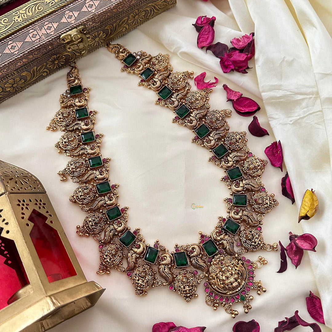 Elevate your style with our Exquisite Green AD Stone 1 gm Gold Lakshmi Haram. Handcrafted from 1gm gold, adorned with stunning green AD stones and featuring the goddess Lakshmi, this piece exudes luxury and elegance. Perfect for special occasions, it will add a touch of sophistication to any outfit.